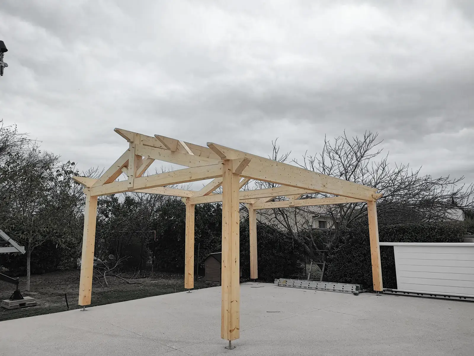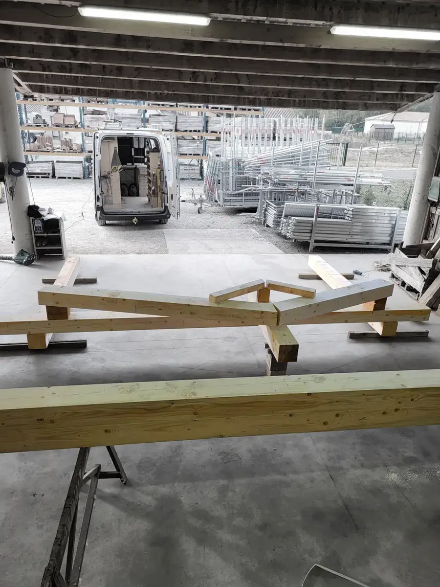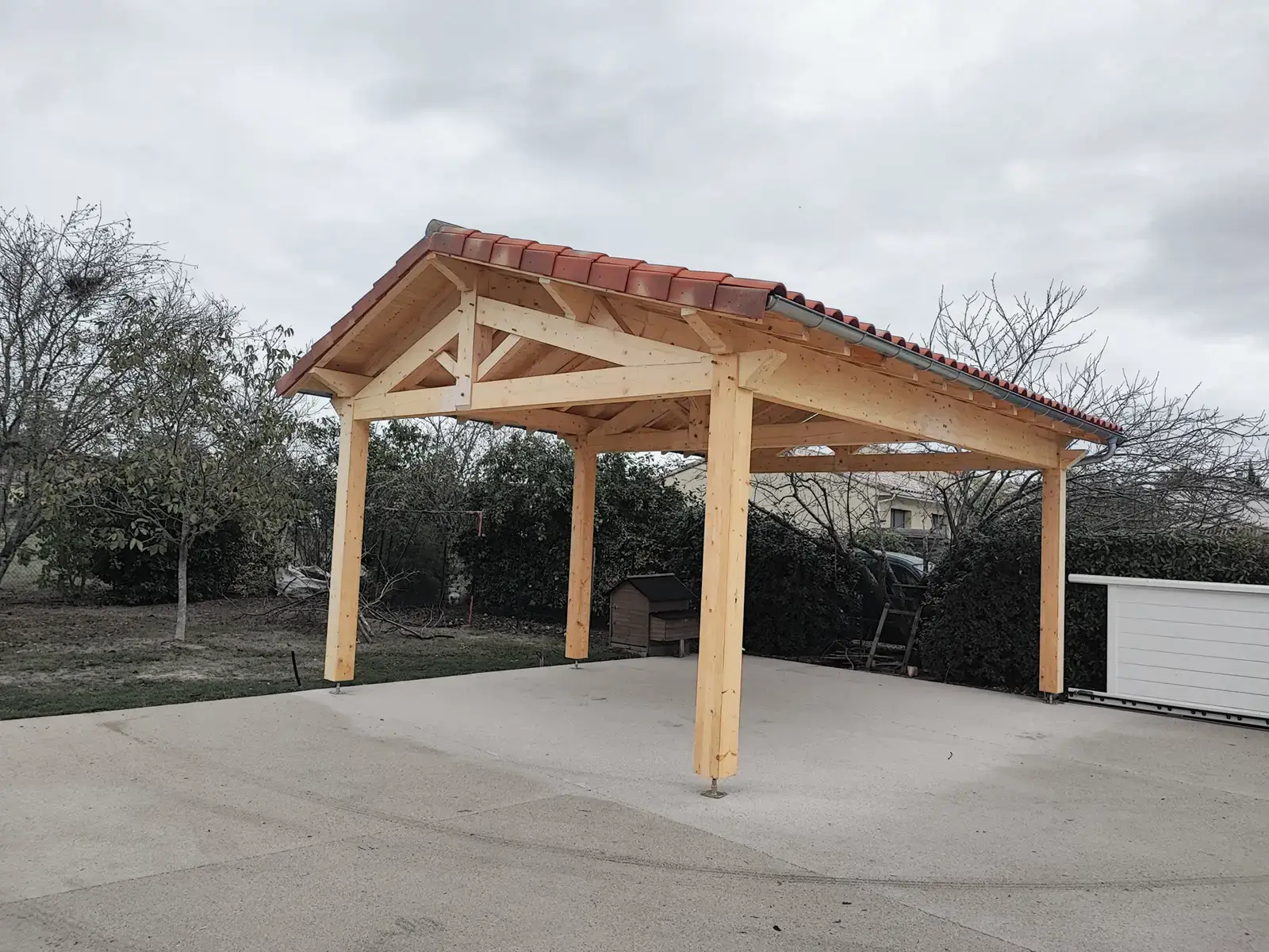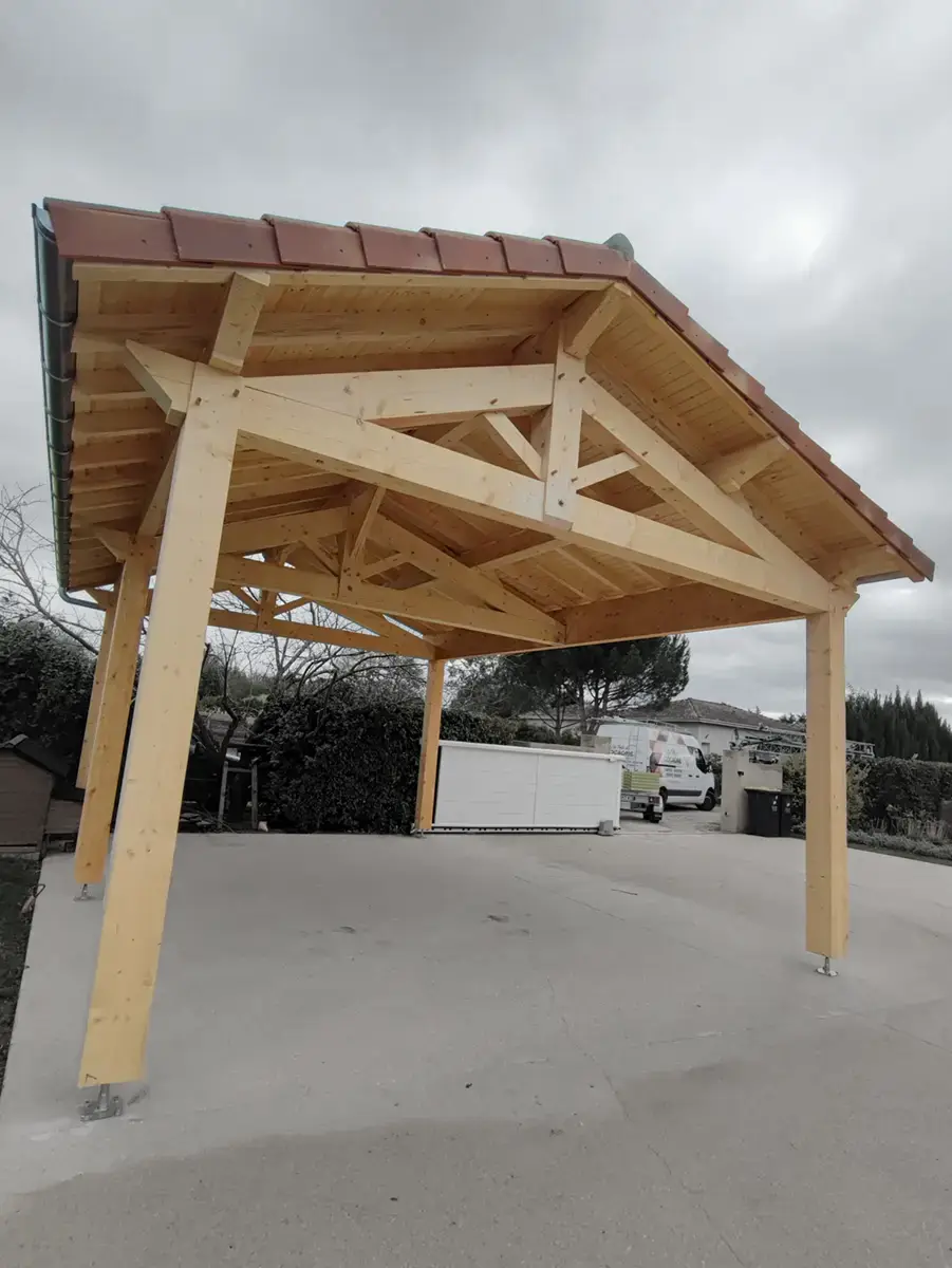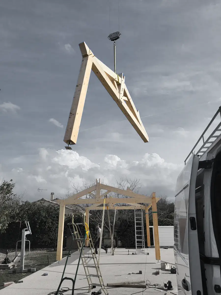 Charpente traditionnelle en sapin raboté et couverture en tuile Galléane 12.